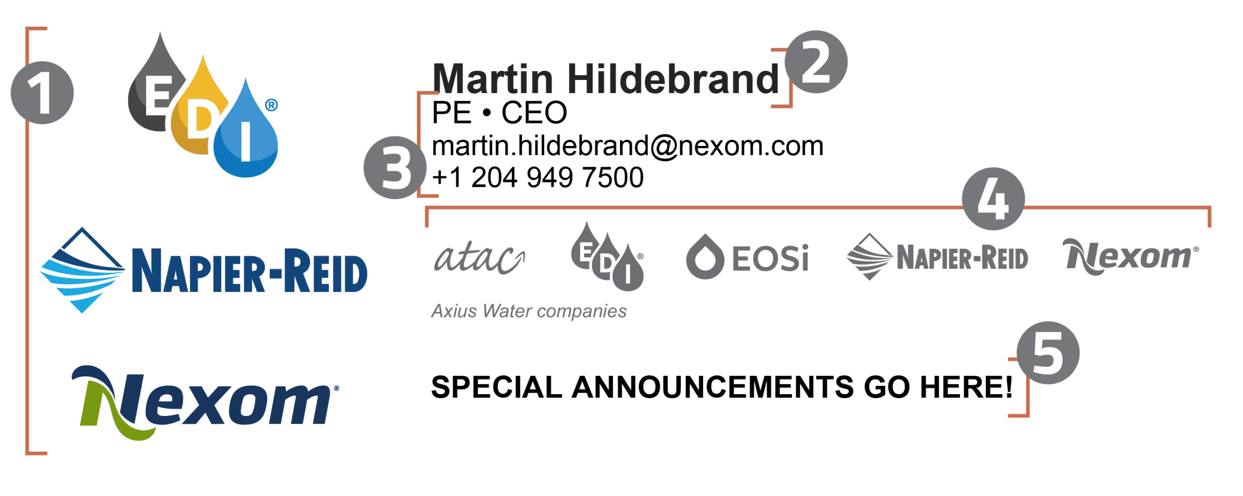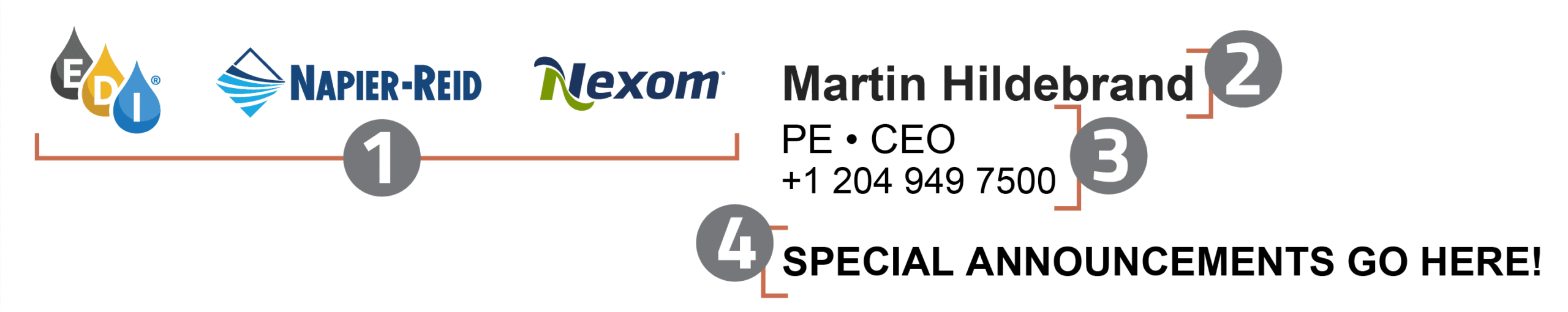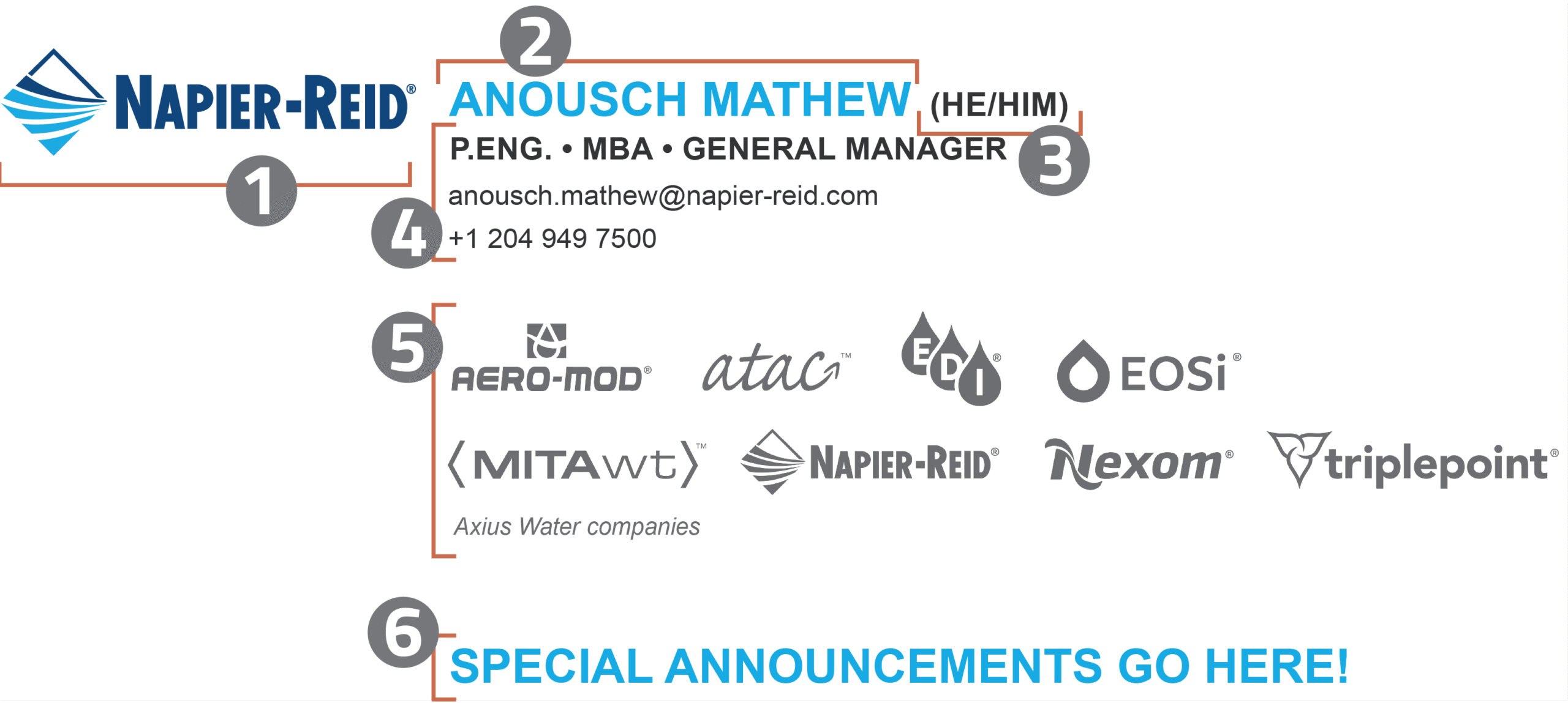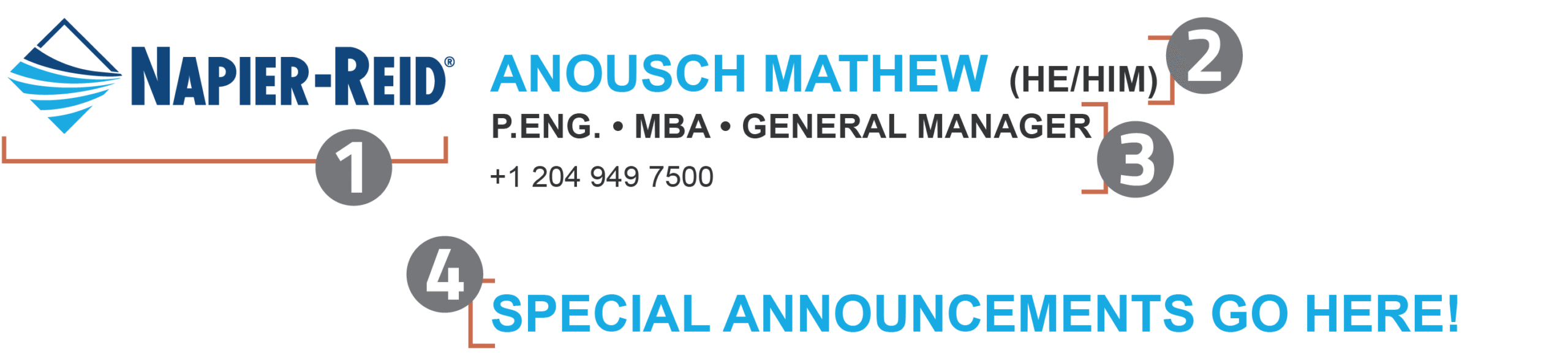 A. By popular demand, Napier-Reid has provided our team with both, because we recognize that, although we’ve worked hard to represent our brand in a compact space, the Full Signature still takes up a few lines. When you’re emailing back and forth internally, or sending a response to someone externally who knows us well, scrolling past the full signature becomes tiresome (and can eat up an extra page when printed).